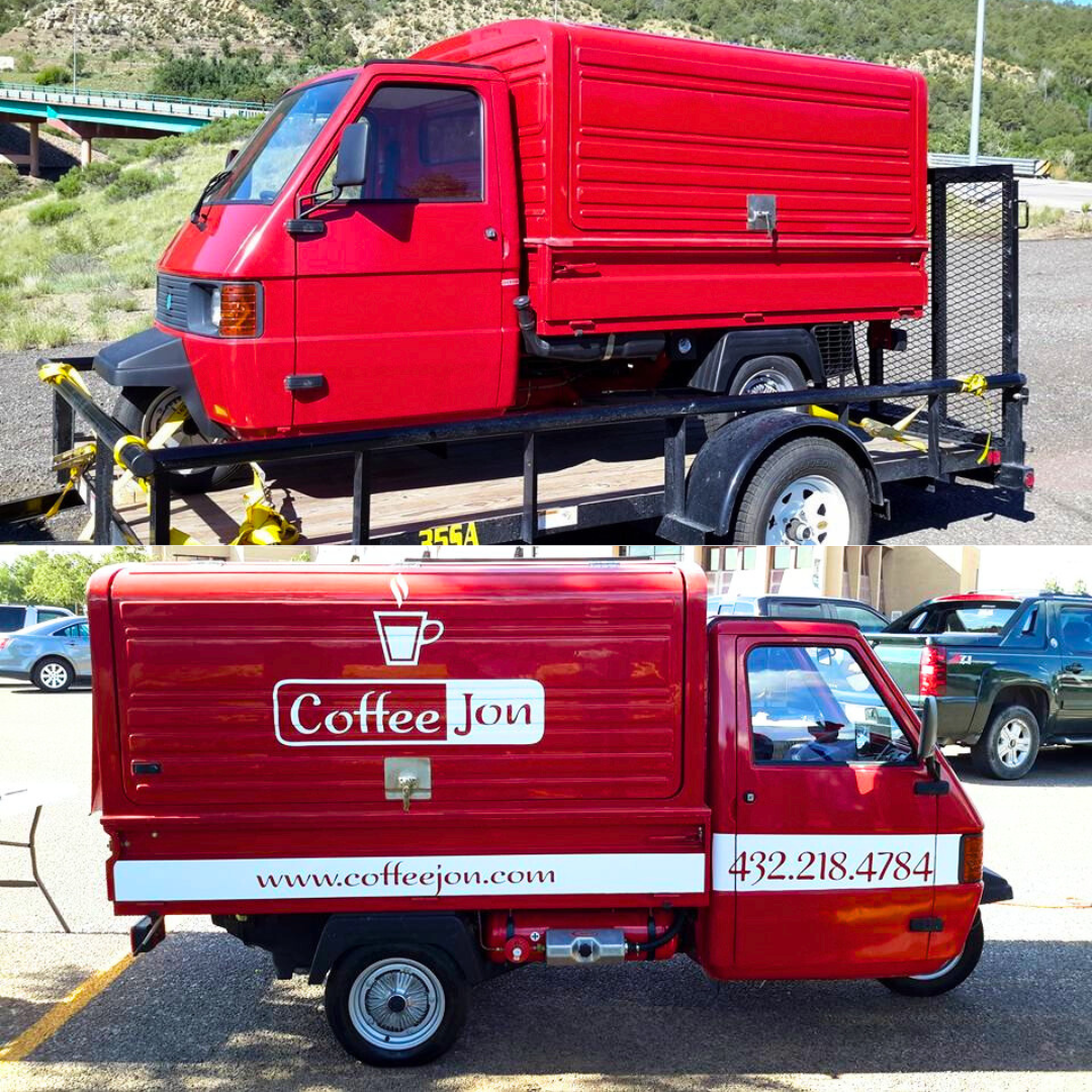 After deciding to go the coffee truck route, we found a 3-wheeled little beauty: an Italian-made Piaggio Ape that was outfitted as a coffee truck in England and imported to Denver, Co. We bought and trailered our new prized possession back down to Midland, Tx where we’ve served thousands of beverages since!